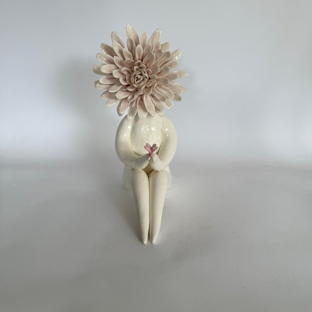 Mrs Chrysanthemum holding a butterfly is handmade in porcelain with underglaze colour and a clear glaze. 17cmH x 6cmW x 12cmL