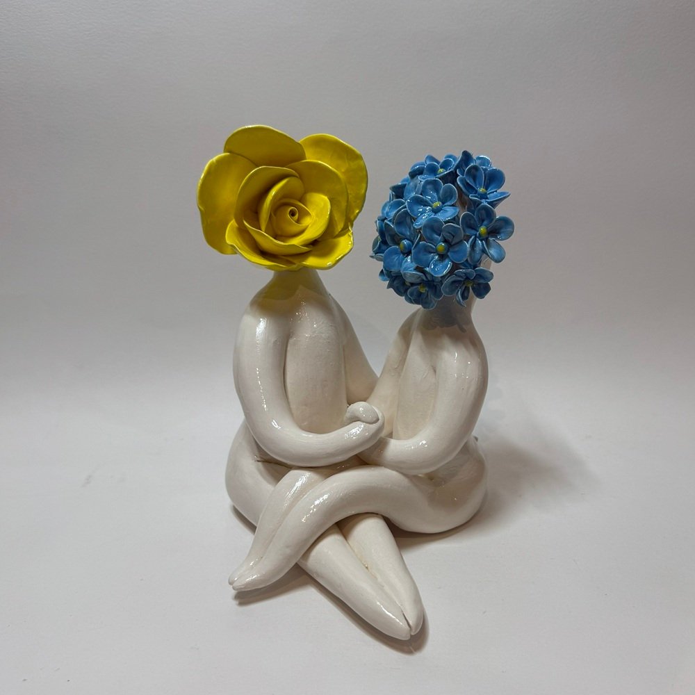 Mr & Mrs Couple Sculpture is handmade in Porcelain clay with underglaze colours. Parian is a self-glazing clay body that imitates marble. 14wcm x 12Hcm